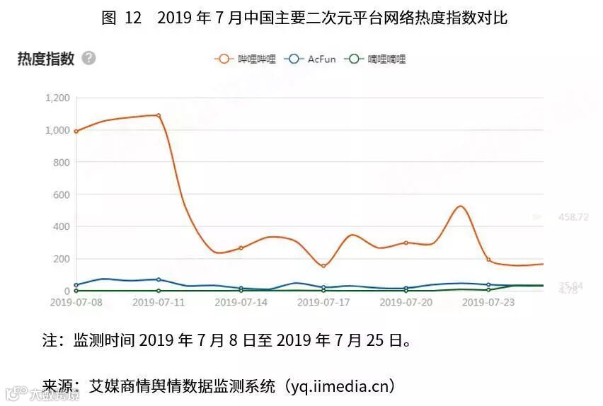 艾媒商情舆情数据监测系统显示,哔哩哔哩、AcFun、嘀哩嘀哩三家二次元平台的网络平均热度值分别为458.72、35.94、4.78,哔哩哔哩的网络热度远超同类平台。近年来,哔哩哔哩的影响力不断扩大,逐渐取代AcFun成为二次元领域的领头羊。