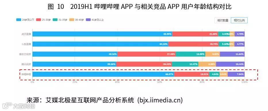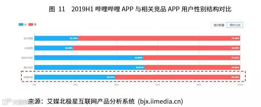 在性别构成上,哔哩哔哩APP男性用户占比达60.5%,其男性用户比例低于两大游戏直播平台APP,高于爱奇艺和腾讯两大综合视频APP。