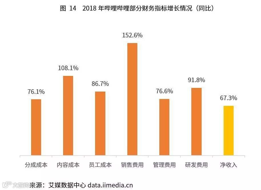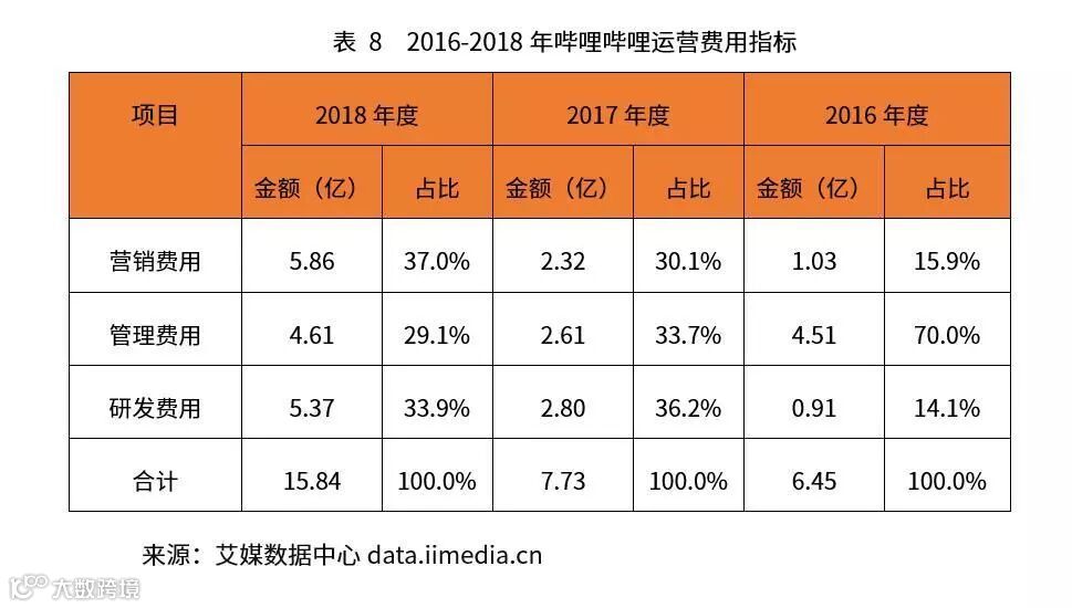 2016-2018年,哔哩哔哩的业务总成本分别为7.73亿元、19.19亿元、32.73亿元。总成本随着收入的增加不断增长,但结构上变化较大。2016年带宽成本为公司最主要的成本,占比达41.7%,随着运营商流量资费下降,该部分成本压力有所缓解,涨幅相对较小,至2018年带宽成本占比下降至18.9%。目前,公司最主要的成本为分成成本,即支付给游戏开发商、分销渠道以及平台内容创作者的费用,2018年该部分支出额达16.31亿元,在总成本中占比为49.8%,较2017年增加1.5个百分点。2018年增长较多的还有内容成本,支出额为5.43亿元,占总成本的比例为16.6%,较2017年增加了3个百分点。