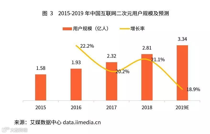 在互联网以及移动互联网的发展推动下,中国网民对二次元文化的接受程度不断加深,二次元逐渐从小众市场向大众市场渗透,受众群体由核心二次元用户拓展至泛二次元群体,用户规模持续增加。iiMedia Research(艾媒咨询)数据显示,2018年中国互联网二次元用户规模为2.81亿人,用户增长率达21.1%,2019年用户规模有望增至3.34亿人。