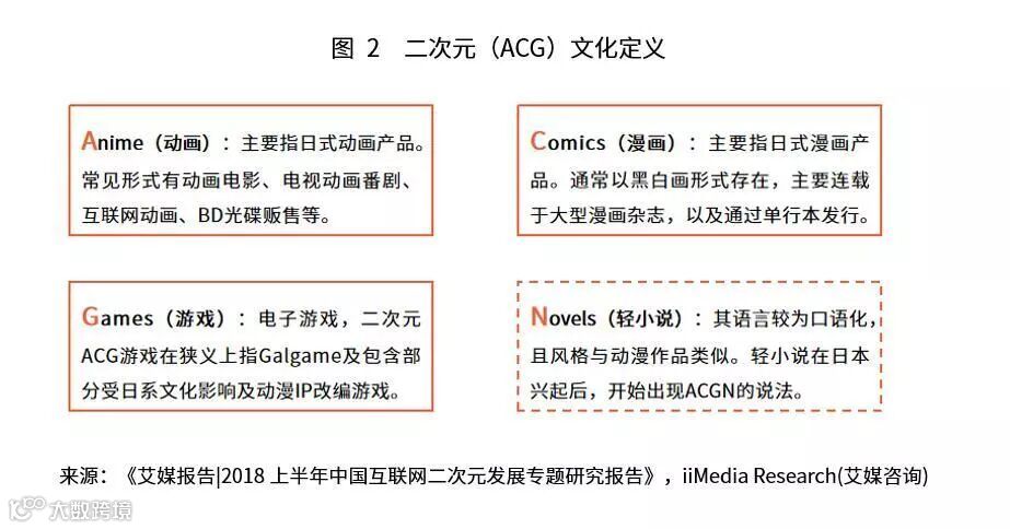 “二次元”一词起源于日本,本义为二维、平面,由于早期日本动画、游戏等作品均以二维图构成,因此以“二次元”指代其中角色。后随文化发展,“二次元文化”一词开始泛指动画(Anime)、漫画(Comic)、游戏(Game)、轻小说(Novel)(ACGN,由于前三者讨论范围较广,或称ACG)内容及其衍生的同人创作、影视改编、周边商品等。互联网发展扩大了二次元文化覆盖面和传播广度,更多非核心层次二次元人群有机会接触、了解二次元内容及文化,泛二次元群体不断扩大。