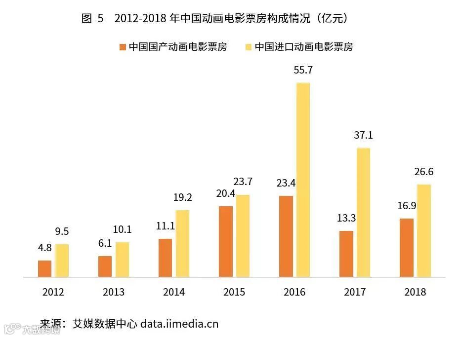 iiMedia Research(艾媒咨询)数据显示,中国动画电影整体票房在2016年达到高峰后出现下降。整体下降趋势延续至2018年,但结构上逐渐出现分化,2018年中国本土动画电影票房为16.9亿元,率先回暖,较2017年增长3.6%。