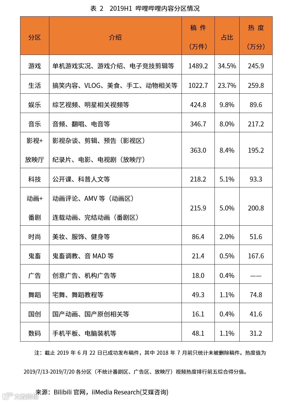 从视频数量看,以游戏、生活内容居多。截止2019年6月22日,游戏区稿件数1489.2万,占比34.5%,生活区稿件数1022.7万,占比23.7%。