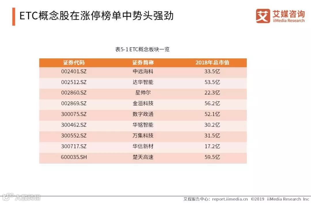 2019年,中国政府有关部门消息称,计划两年内基本实现取消全国高速公路省界收费站并继续大力推动ETC行业发展,增大ETC在全国范围的利用率,而且目前已取得阶段性的进展,这一政策的推出短期利好ETC概念股。