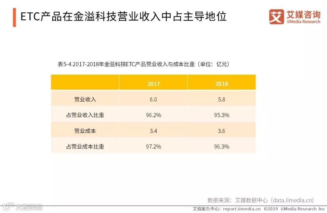 2018年,金溢科技高速公路ETC产品的营业收入为5.8亿元,占总营业收入的95.3%,较2017年减少0.9%;而2018年ETC营业成本占总体营业成本的比重为96.3%,同比减少0.9%。可见,ETC产品的投入与销售主要构成金溢科技的营业收入及营业成本来源。