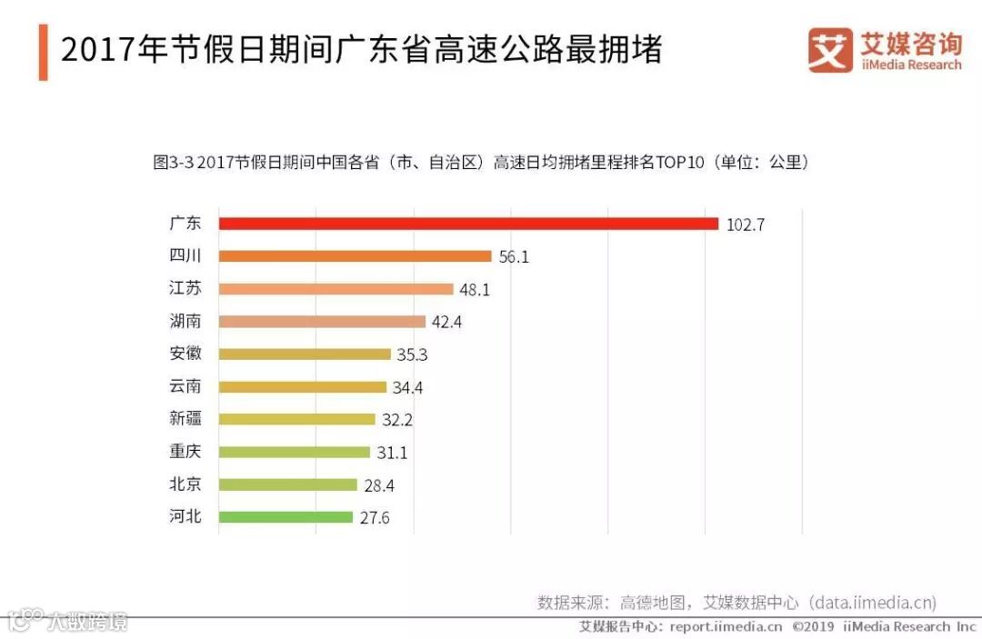 根据中国2019年节假日期间各省高速日均拥堵里程的排名,广东、四川、江苏、湖南、安徽、云南、新疆、重庆、北京及河北进入榜单前十,其中广东省位于榜首,拥堵里程达102.7公里,几乎是排位第二的四川省的2倍,成为2017年度节假日期间高速公路最拥堵省份。