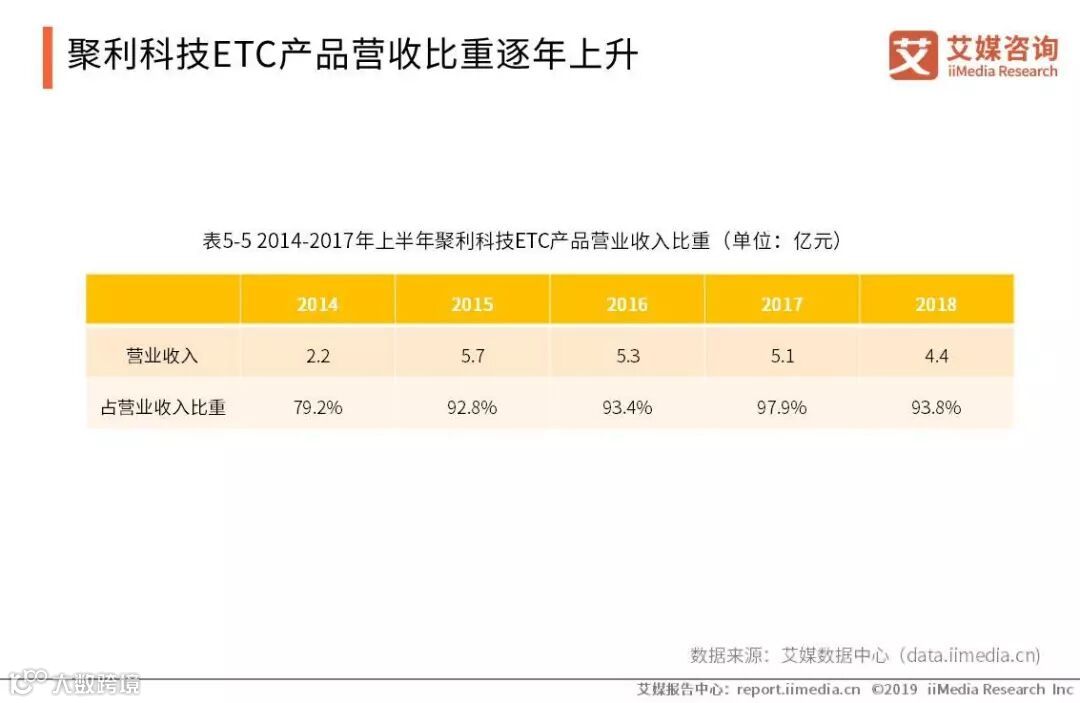 聚利科技的主营业务收入主要由ETC系列产品、出租车计价器及GPS车载终端几类构成,目前,ETC产品占据主导位置。2014-2017年,聚利科技ETC产品的营业收入不断增长,至2017年达到97.9%。2018年,聚利科技的产品销售情况略有调整,ETC产品的营业收入占总收入的93.8% ,仍然为主要收入来源;同时,该公司的GPS车载终端系统的销售比例有明显提高。