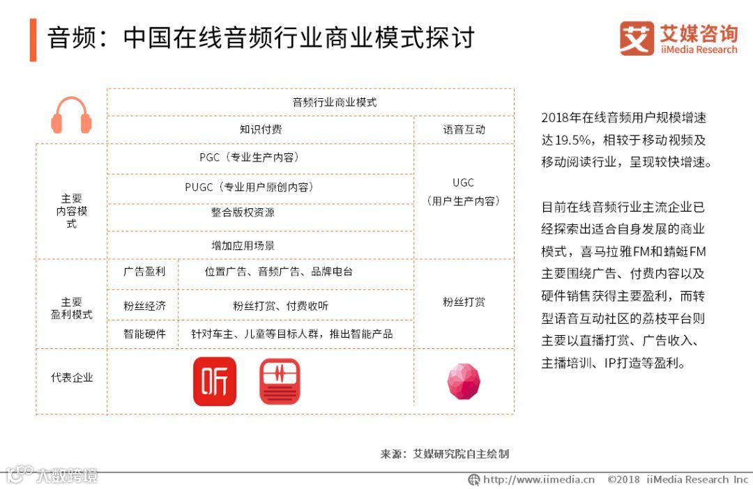 2018年在线音频用户规模增速达19.5%,相较于移动视频及移动阅读行业,呈现较快增速。目前在线音频行业主流企业已经探索出适合自身发展的商业模式,喜马拉雅FM和蜻蜓FM主要围绕广告、付费内容以及硬件销售获得主要盈利,而转型语音互动社区的荔枝平台则主要以直播打赏、广告收入、主播培训、IP打造等盈利。