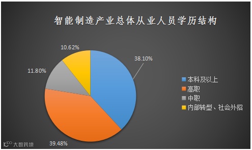 4.【学历分布】通过对智能制造装备企业进行调研,高职学生占比最高为39.48%,紧随其后的是本科及以上的,所占比例为38.1%;中职学生占比11.8%;剩余10.62%则为内部转型、社会外招。