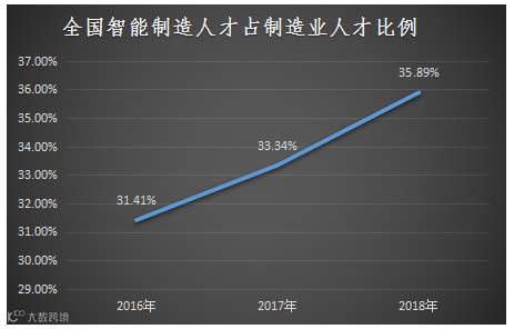 猎聘大数据显示,截至2018年底,中国智能制造中高端人才占整个制造业中高端人才的35.89%,与2016年、2017年相比,智能制造人才在制造业人才中的占比呈逐年增长态势。