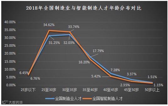 对比智能制造与制造业人才年龄分布情况可以看出,智能制造人才在25至30岁、30至35岁年龄段的人才占比高于制造业,35至40岁、40至45岁、45至50岁、50岁以上年龄段的人才比例均低于制造业,说明从事智能制造岗位的年轻人比传统制造业更多,年龄优势能给智能制造的发展带来更多的想象空间。