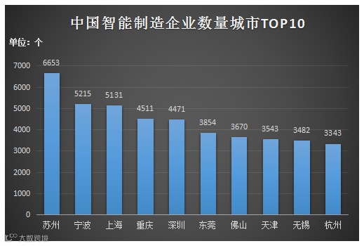 6.【企业分布】据《世界智能制造中心发展趋势报告(2019)》报告显示,智能制造企业数量排前十的城市,分别是苏州、宁波、上海、重庆、深圳、东莞、佛山、天津、无锡和杭州。其中苏州数量最高达6653家;宁波和上海旗鼓相当,分别为5215家和5131家。