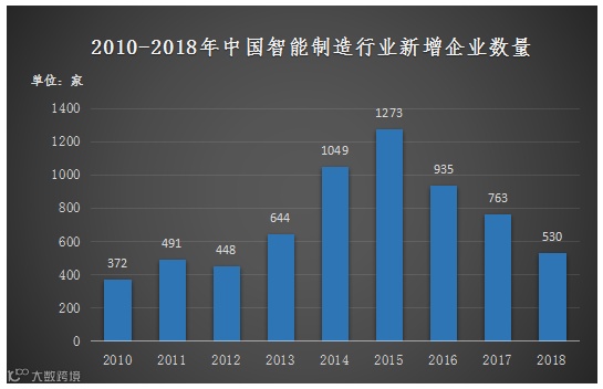 2014-2015年中国智能制造行业新成立企业数量骤增,处上升风口时期,工业巨头、互联网科技等领域企业拓展业务范围,积极转型,进军智能制造行业。2015年新增企业数量达到顶峰,2016年以后,中国智能制造新增企业数量开始降低,开始纵向拓展和深化智能制造关键技术和应用领域。