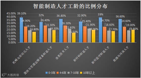 2.【工龄分布】从业年限上看:国防与交通运输设备制造、新材料制造及能源与环保这三大行业的人才平均从业年限都比较高,并且具备十年以上从业经验的人才占比也相对较大。