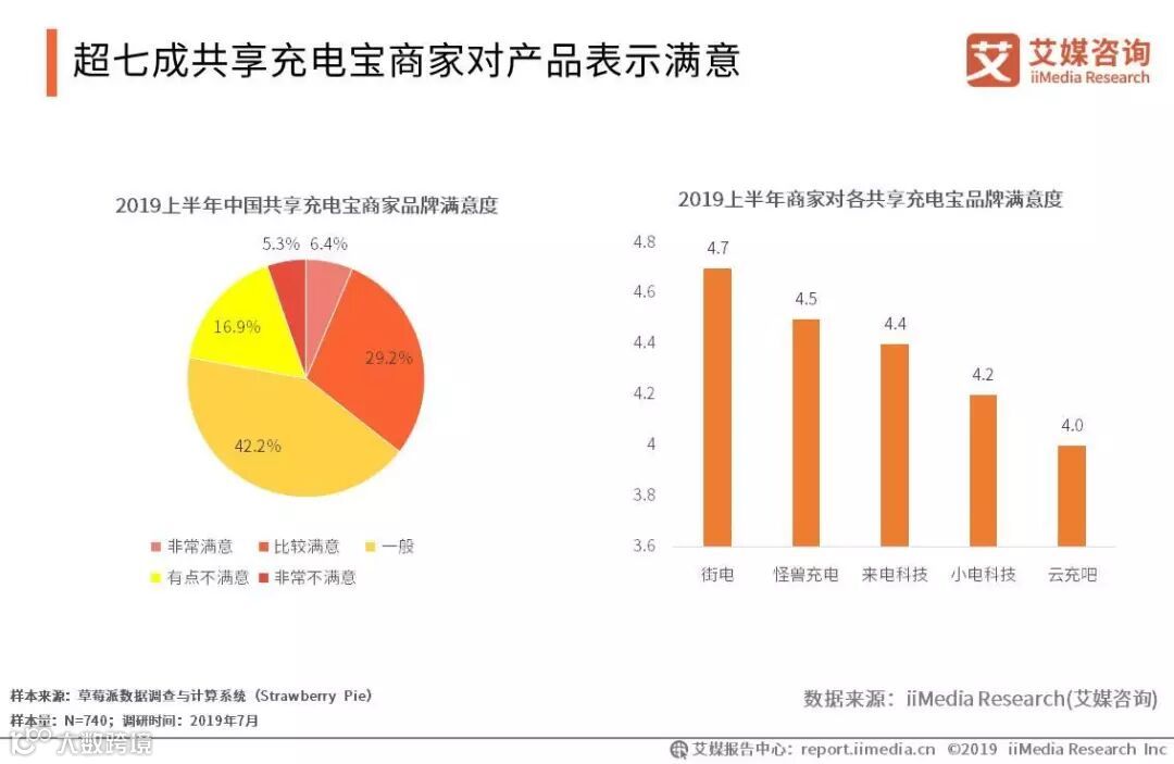 iiMedia Research(艾媒咨询)数据显示,2019上半年,商家对共享充电宝表示满意的态度占总体满意度的35.6%,持中立态度的商家占比为42.2%,当前商家的满意度成中立偏好,但仍有较大提升空间。在商家满意度调研中,街电、怪兽充电以4.7和4.5的满意度领先其他品牌,排名前两位。