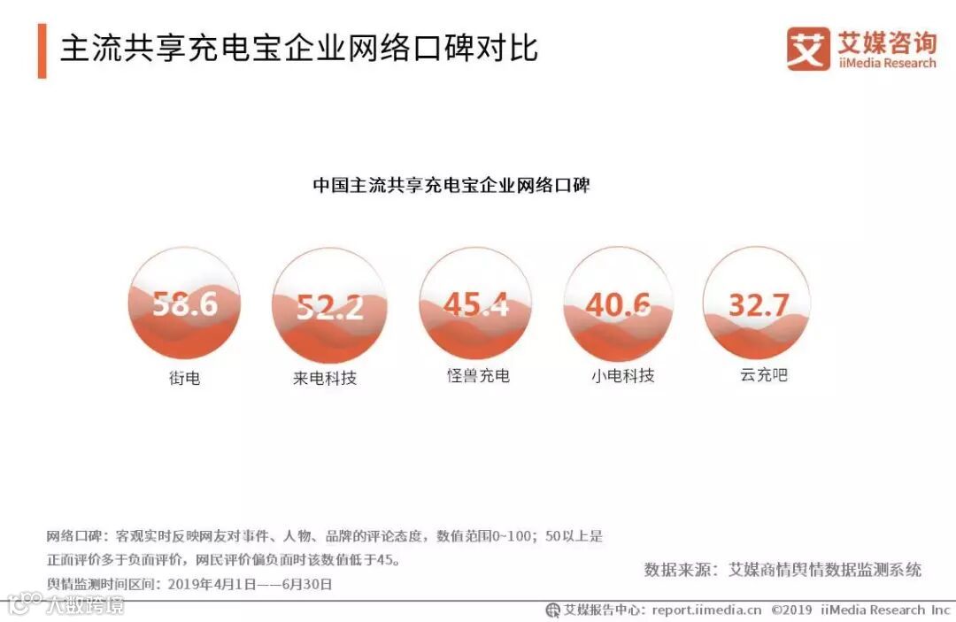 iiMedia Research(艾媒咨询)数据显示,2019上半年,街电和来电科技两家企业在行业内正面网络评价相对较高,网络口碑指数分别为58.6和52.2;而小电科技和云充吧的网络评价指数均低于45,网民评价偏负面。