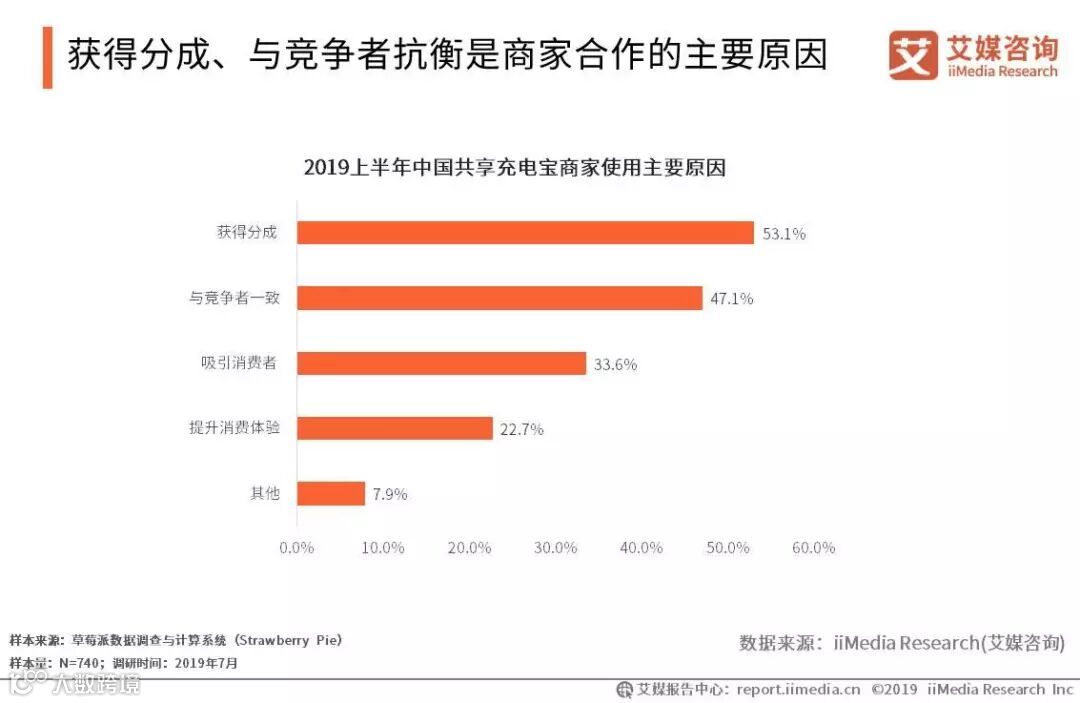 iiMedia Research(艾媒咨询)数据显示,2019上半年,商家与共享充电宝品牌合作的主要原因,是获得共享充电宝利润的分成和与同行竞争者保持一致。吸引消费者和提升消费体验是商家与共享充电宝合作的次要原因。