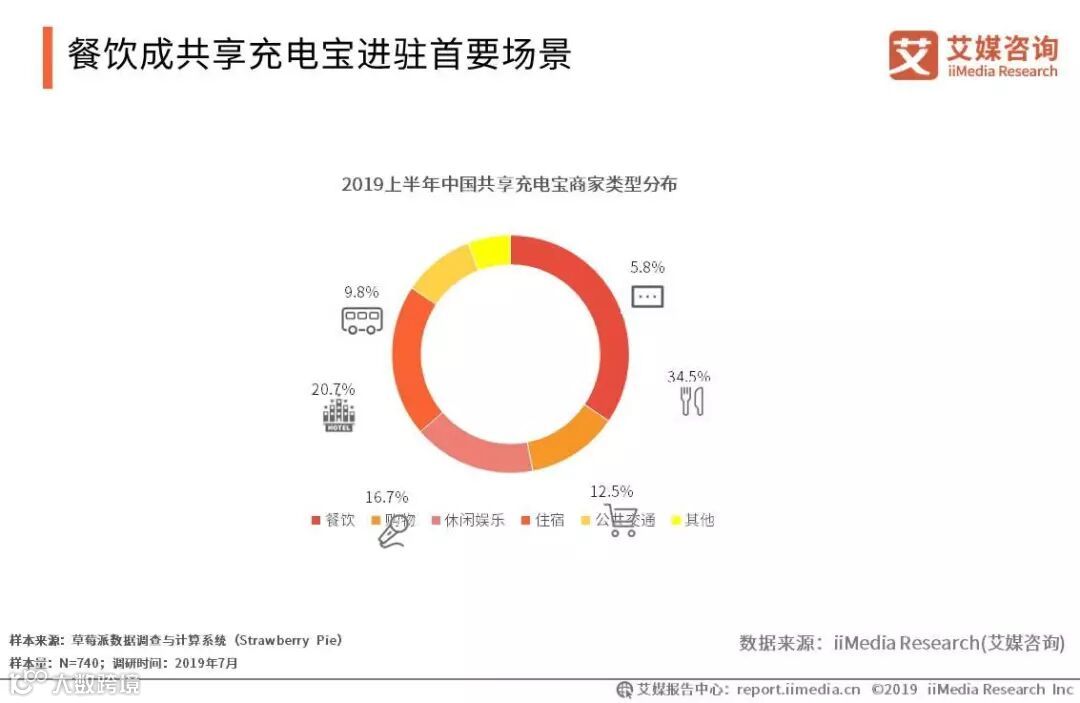iiMedia Research(艾媒咨询)数据显示,2019上半年,共享充电宝品牌主要与餐馆等餐饮行业的商家合作较为密切,其次是酒店、旅店等住宿场所的商家。艾媒咨询分析师认为,共享充电宝品牌在未来将会增加在地铁站、火车站、机场等公共交通场所和会展中心等地的设备铺设。