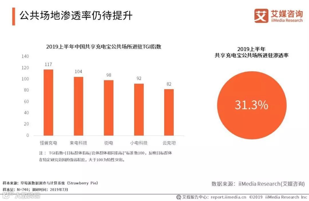 iiMedia Research(艾媒咨询)数据显示,中国共享充电宝进入的公共场地包括车站、机场、公共图书馆等,并主要以大机柜和小机柜模式进驻。2019上半年中国共享充电宝公共场所进驻渗透率为31.3%,怪兽充电和来电科技的TGI指数决均大于100,高于行业水平,两家当前在公共场地有较高的渗透率。