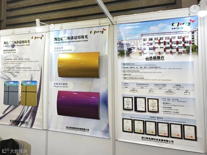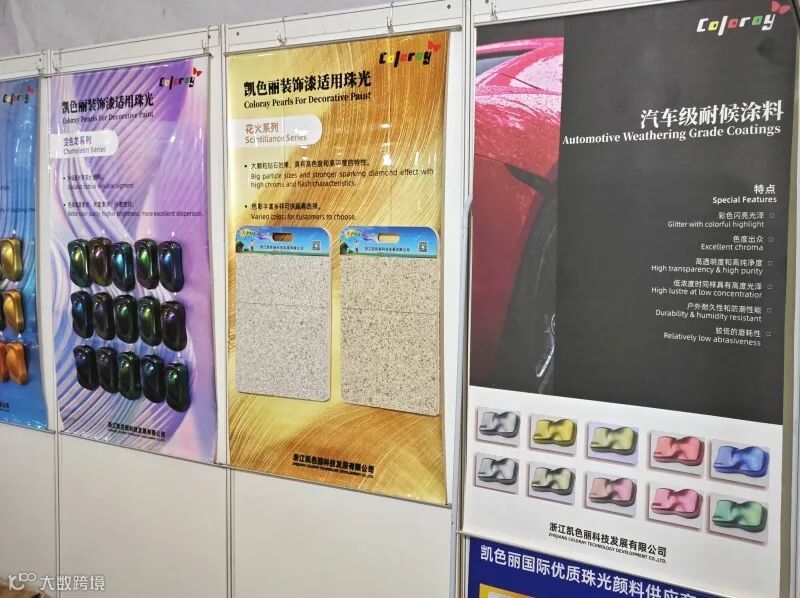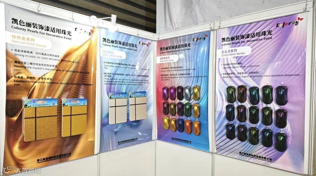 展会现场,凯色丽重点展出了变色龙系列、斯塔克系列、乌金系列、无机洋红系列、耐候系列以及近两年凯色丽推出的工业级全新颜色的系列产品。