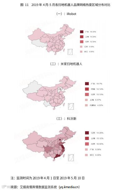 网络热度区域分布方面,iRobot网络热度主要集中在广东,上海以及北京等地。米家扫地机器人网络热度主要分布于广东、河南及北京等地。科沃斯网络热度分布较为均匀,分布于江苏、上海及北京等地。