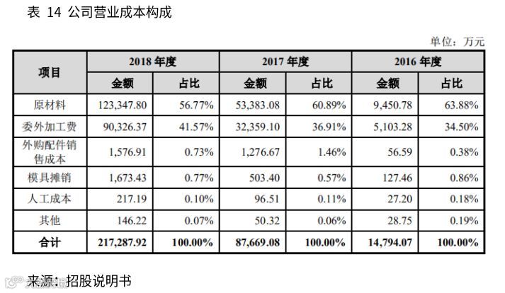 具体来看,营业成本主要由原材料和委外加工费构成。2016年、2017年和2018年,原材料成本占营业成本比例分别为63.88%、60.89%和56.77%,委外加工费占营业成本比例分别为34.50%、36.91%和41.57%。营业成本中,原材料占比逐年下降,委外加工费占比逐年提升,主要由于部分自采材料改由委托加工厂代采所致。