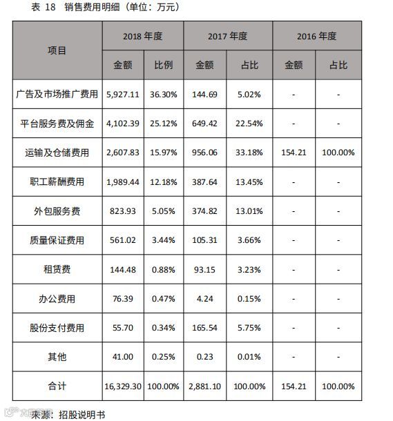 相比2017年,2018年销售费用增加了1.34亿元,同比增长466.77%,主要是广告及市场推广费用增加5.78亿元,平台服务费及佣金增加3.45亿元,运输及仓储费用增加0.17亿元以及职工薪酬费用增加 0.16亿元。广告及市场推广费用增加主要系2018年拓展电商销售渠道,并加大广告推广力度导致。平台服务费及佣金增加主要系在新增第三方 B2C 平台数量的同时,各平台销售额增加较大所致。运输及仓储费用增加主要系生产经营规模扩大所致。职工薪酬费用增加是由于销售人员增加。