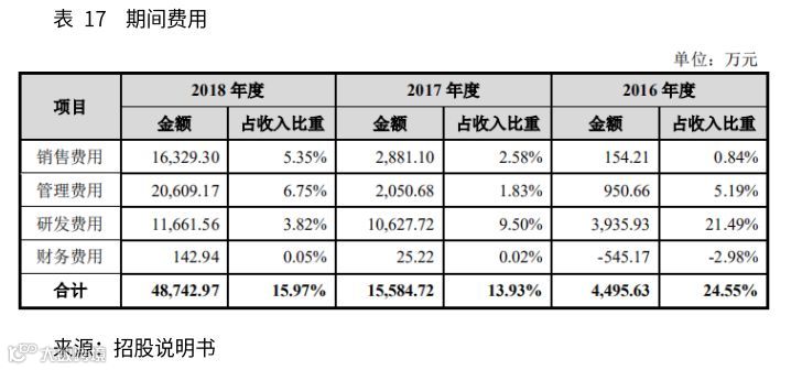 报告期内,公司期间费用分别为0.45亿元、1.56亿、4.87亿,占同期收入比重分别为24.55%、13.93%、15.97%。结构上,2016年、2017年研发费用比重较高,2018年销售费用和管理费用增长明显,占营收的比例分别为5.35%、6.75%。