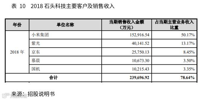 2018年公司前五大客户为小米集团、紫光、京东、慕晨、国机,销售收入占总营收的比例达78.64%。小米集团为公司的关联方,是目前公司最大客户,它通过自有渠道及第三方分销渠道将米家品牌销售至个人消费者,2018年该客户的销售收入占石头科技总营收的比例高达50.17%。紫光、慕晨、国机为石头科技自有品牌的线下经销商,销售收入占比分别为13.17%、3.50%、3.35%。京东是线上销售渠道,销售收入占比为8.47%。