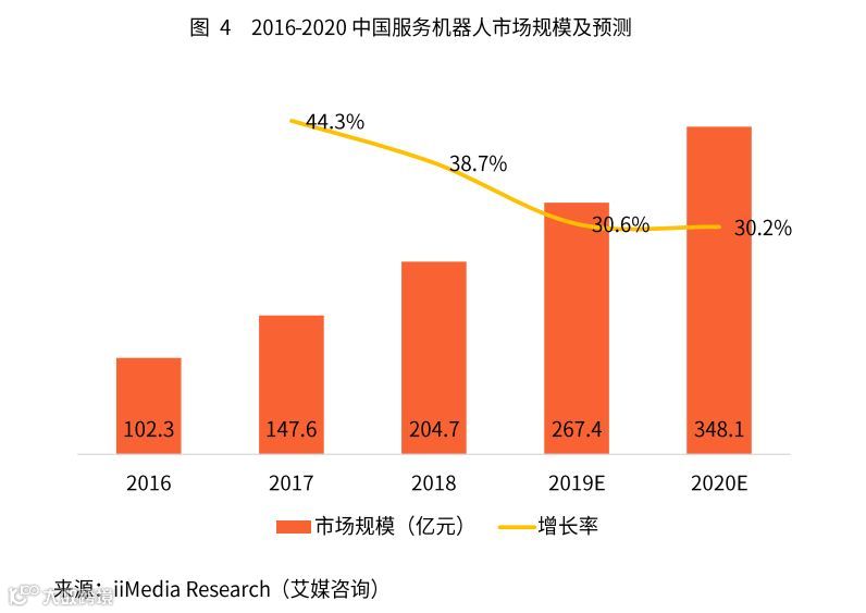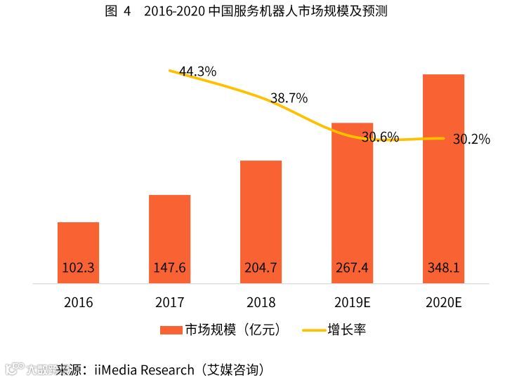 iiMedia Research(艾媒咨询)数据显示,2018年中国服务机器人市场规模为204.7亿元,增长率为38.7%,预计到 2020 年,中国服务机器人年销售额将超过 300 亿元。