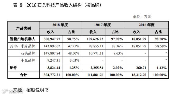 公司在成立初期,缺乏自有品牌,主要以定制方式生产米家品牌,销售方面采用小米模式,2016年收入几乎全部来自米家品牌,对小米的依赖性极高。2017年公司推出自有的石头品牌,贡献收入1.07亿,占总营收的比例为9.63%。2018年又推出小瓦品牌,随着公司自有品牌的大幅增长,公司收入结构出现较大变化,米家品牌营收占比下降至47.21%,自有品牌营收占比上升至51.53%。