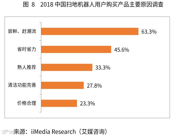 iiMedia Research(艾媒咨询)数据显示,中国扫地机器人用户购买产品的主要原因是尝鲜、赶潮流,这部分用户超过六成。对于这些用户来讲,尝鲜过后,如果实用性不足,可能将不会进行再次购买或者再次推荐。