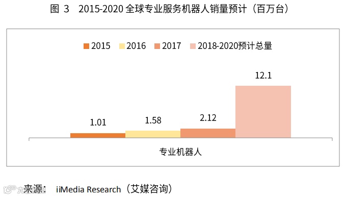 2017年全球专业服务机器人销量为212万台,预计2018-2020年期间,专业服务机器人销售量会增加到1210万台。