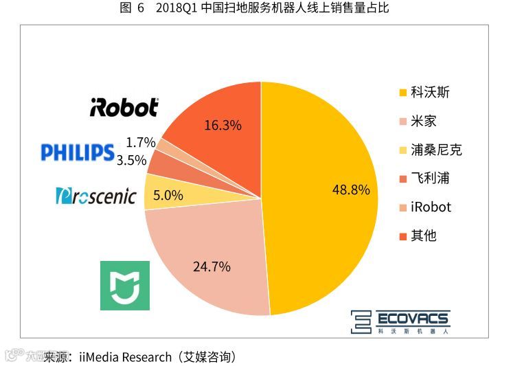 其中,扫地机器人在整个服务机器人市场是非常重要的一个细分领域。产品相对成熟,竞争相对激烈。iiMedia Research(艾媒咨询)数据显示,2018年第一季度科沃斯占据中国扫地机器人线上市场的48.8%,领先优势明显。米家以24.7%的销量占比位列其后。