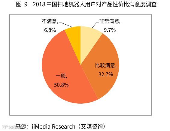 iiMedia Research(艾媒咨询)数据显示,2018年中国扫地机器人用户对产品性价比满意度的调查方面,非常满意的只占9.7%,比较满意的比例为32.7%。