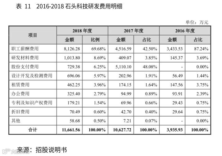 根据招股书披露,2016年、2017年和2018年石头科技的研发费用金额分别为0.39亿元、1.06亿元和1.17亿元,占营业收入比例的21.49%、9.5%和3.82%。虽然研发投入金额上涨明显,但整体力度却呈现一定程度的衰减。且在核心技术方面,公司较为缺乏。石头科技在招股书中说明其产品应用了激光雷达技术,可以通过AI算法智能规划清扫路径,但这些技术非独家核心技术优势,在其他竞品中也有相应的一些技术。