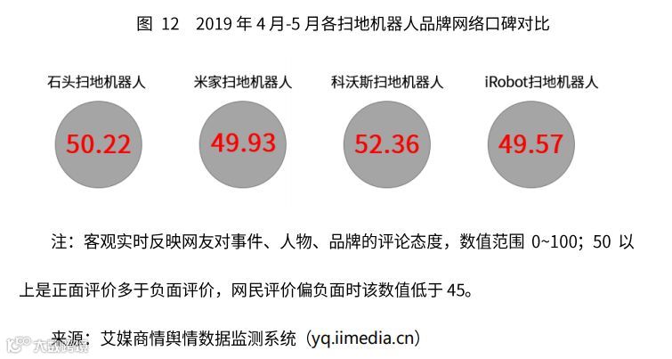 从网络口碑来看,科沃斯表现相对较好。艾媒商情舆情数据监测系统显示,科沃斯扫地机器人的网络口碑为52.36,石头扫地机器人的网络口碑为50.22。