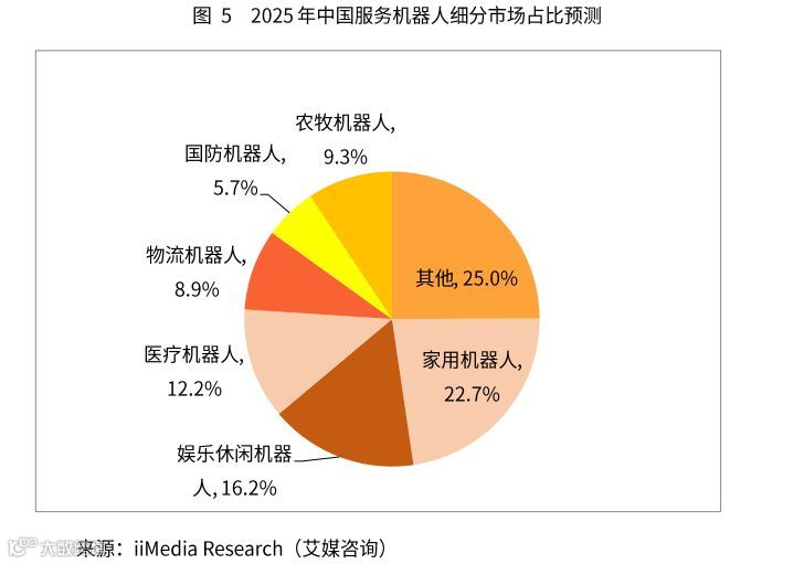 预计2025年中国服务机器人细分领域市场份额前三位将是家用机器人、娱乐休闲机器人、医疗机器人。