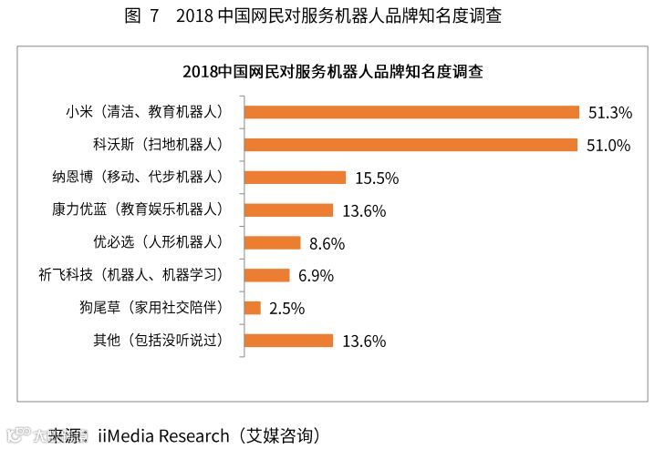 iiMedia Research(艾媒咨询)数据显示,在中国服务机器人品牌中,小米、科沃斯以及纳恩博用户知名度较高,分别有51.3%、51.0%以及15.5%的占比,排名前三。