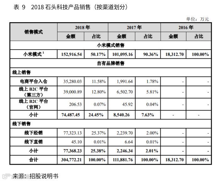 公司成立时间较短,产品种类相对较少。虽然公司也在积极拓展其他产品种类,但短期内想象空间有限。目前在经营方面严重依赖小米,包括产品及销售等方面对于小米的依赖性过强。不仅经营业绩依赖小米,且在知识产权以及经营管理方面也缺乏独立性。石头科技的部分知识产权是与小米共有的,这就意味着小米有权自行实施使用石头科技的知识产权,而无需向石头科技通报及分享收益。2016年,石头科技的销售收入全部来自于小米。在其后的两年中,小米公司每年向石头科技采购产品的数量都在大幅增加,带动公司业绩的增长。虽然其对于小米销售的占比在不断下降,但想要脱离却较为困难。