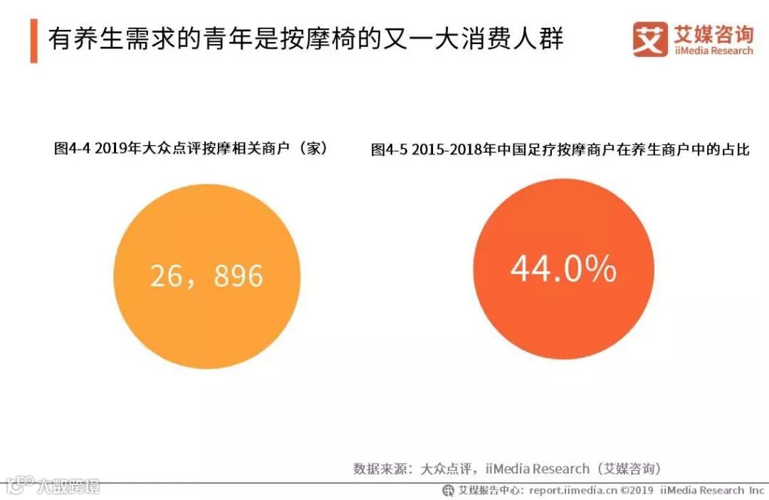 按摩椅的传统消费目标群体为中老年人,但随着养生习惯的扩散蔓延,青年群体也开始成为按摩椅的目标用户。以中青年群体为主要用户的大众点评APP为例,按摩服务商户呈现增加趋势,一定程度地反映了中青年群体对按摩服务的需求。2019年,大众点评APP中提供按摩服务的商家达到26896家,其中,足疗按摩商户在养生服务商户中占四成。