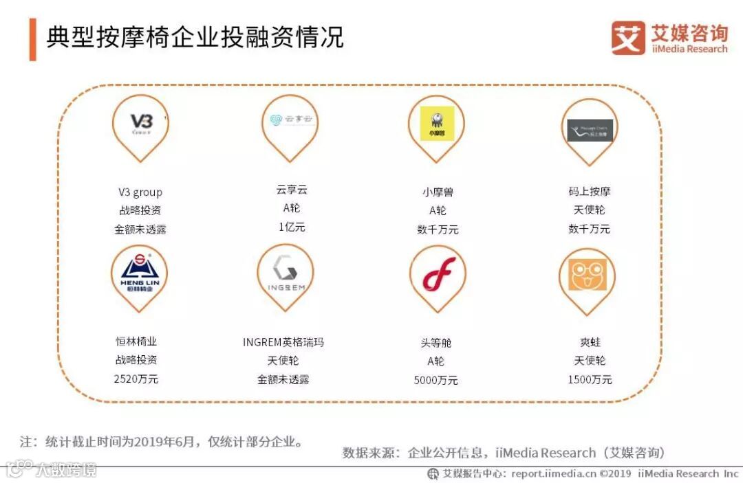 中国老年人数量增长、亚健康人群超75.0%,具有养生需求的人群利好按摩椅市场的发展。2018年,中国按摩椅相关企业获投资金额2.6亿元,平均每笔按摩椅投资额超过5000万元。具体到两大电商销售渠道,按摩椅在天猫商城的月销售千笔以上的单品均价为3158.9元,京东商城热销前十的单品均价为6529.8元。在按摩市场细分企业中,2018荣泰健康、奥佳华第一大品类均为按摩椅,其营收占比分别为83.0%、42.2%。在按摩概念的广泛渗透下,共享按摩椅开始出现,目前主要应用场景在电影院、景区、地铁站、写字楼等。(《2019中国按摩椅产业及共享按摩椅市场分析报告》完整高清PDF版共57页,点击底部“阅读原文”进行报告下载)。
