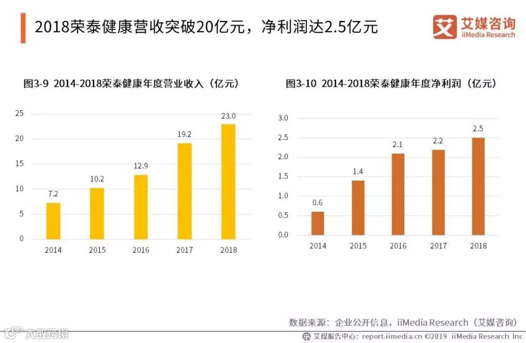 2018年荣泰健康年度营收突破20亿元大关,达23.0亿元,同比增长19.8%。其净利润在2018年达2.5亿元,同比增长13.7%。荣泰健康的年度营收与净利润不断增长,但净利润开始出现增长放缓的趋势。