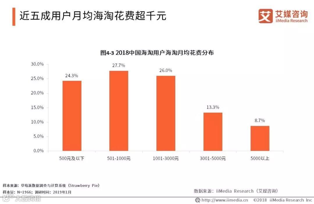 iiMedia Research(艾媒咨询)数据显示,2018年,中国海淘用户海淘月均花费千元以上的占比48%。艾媒咨询分析师认为,随着人们消费水平的提高、跨境电商上下游配套设施服务的完善以及政策限额的提高,中国海淘用户消费将有所提升。