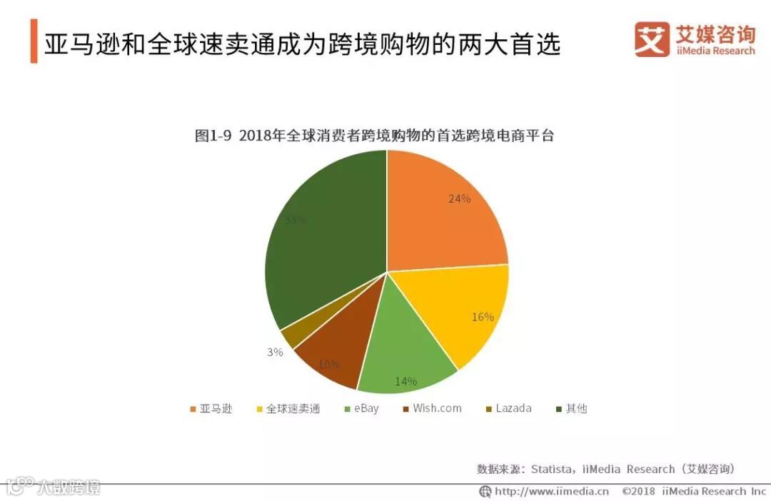 截至2018年,调查显示全球消费者最近一次使用跨境电商平台进行跨境购物,24%的消费者选择了亚马逊,16%的消费者选择了阿里巴巴旗下的全球速卖通(AliExpress),14%的消费者选择了eBay,10%的消费者选择了Lazada。