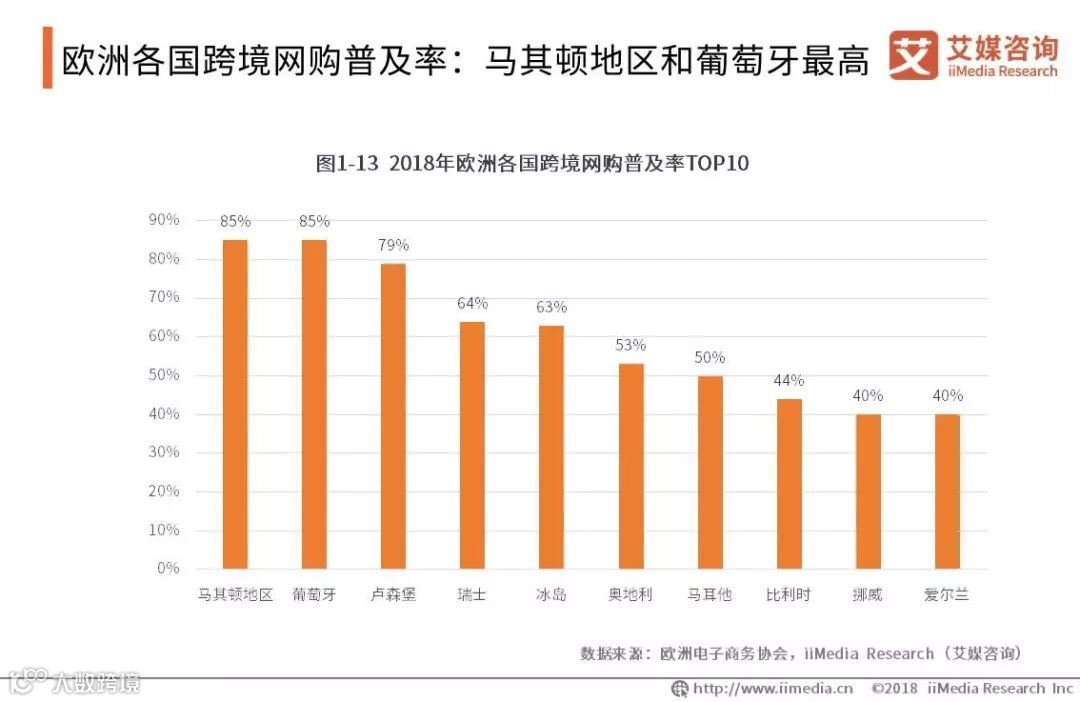 欧洲各国跨境网购普及率:马其顿地区和葡萄牙最高