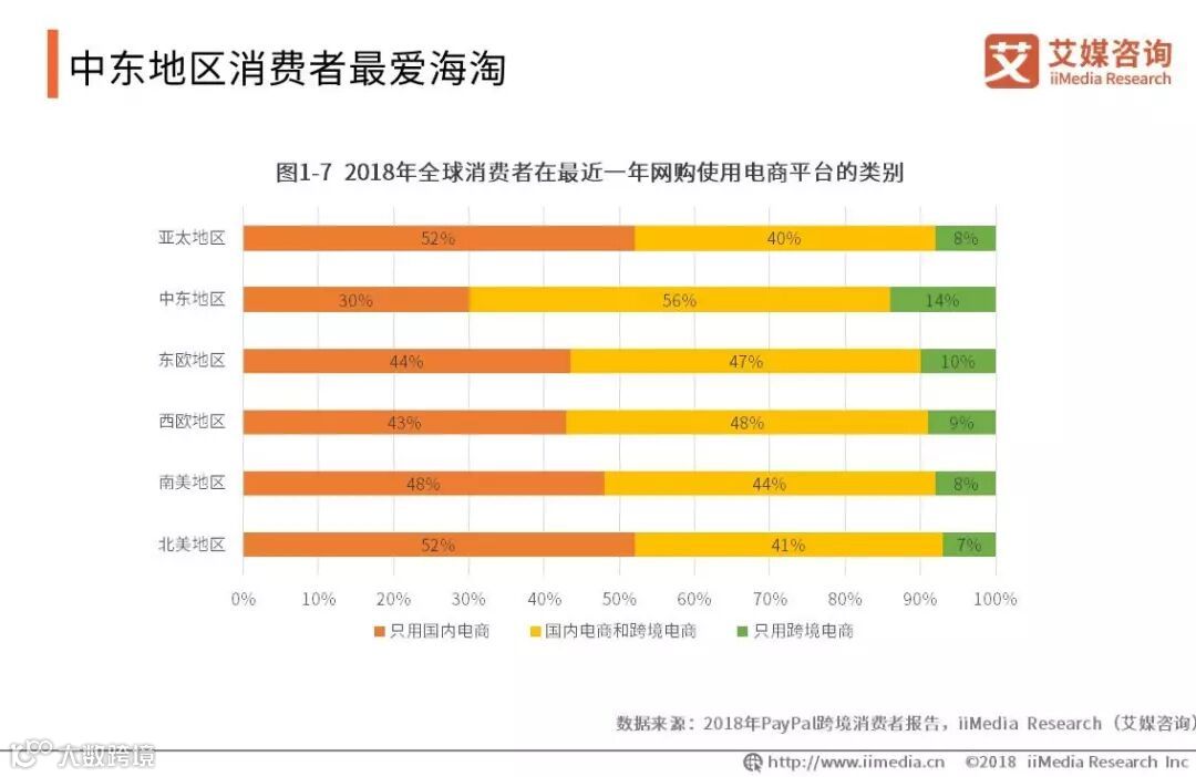 相比其他地区,中东地区使用跨境电商进行网购的消费者占中东地区网购者的比例最高,达到70%,而亚太地区和北美地区的跨境电商使用者不足五成,欧洲和南美地区的海淘消费者则不足六成。