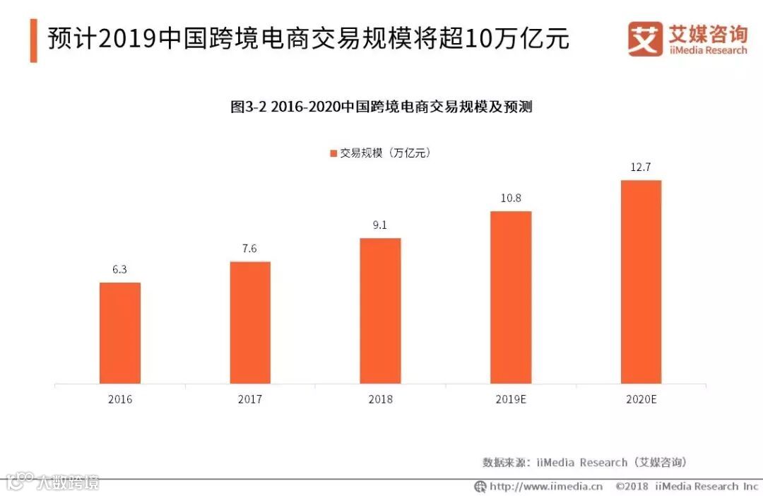 iiMedia Research(艾媒咨询)数据显示,2018年中国跨境电商交易规模达到9.1万亿元,预计2019年将达到10.8万亿。艾媒咨询分析师认为,电商法和跨境电商系列新政的出台将进一步规范中国跨境电商市场,促进跨境电商行业健康发展,同时全球化趋势、消费升级将推动中国跨境电商交易规模持续增长。