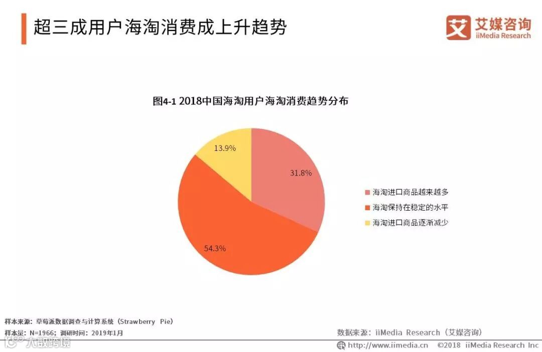 iiMedia Research(艾媒咨询)数据显示,2018年,超三成用户海淘商品越来越多,超五成用户海淘保持在稳定水平。