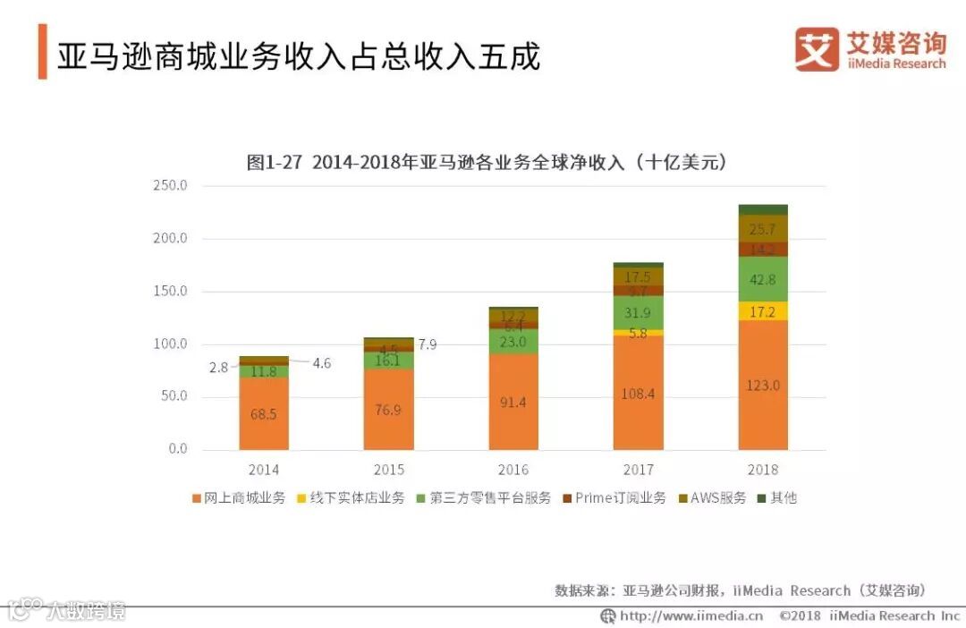 2018年,亚马逊全球净收入为2329亿美元,其中网上商城业务收入为1230亿美元,占总收入的52.8%。线下实体店业务于2017年开展,2018年净收入为172亿美元。第三方平台业务净收入为428亿美元,占总收入的18.4%。